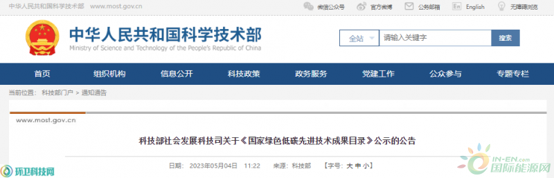 5月4日,科技部社會發展科技司對《國家綠色低碳先進技術成果目錄》予以公示,目錄包括水污染治理、大氣污染治理、固體廢物處理處置及資源化、土壤和生態修復、節能減排與低碳、環境監測與監控六個領域的共87項技術成果,其中固體廢物處理處置及資源化領域有23項技術入選,包括有機固體廢物、生活垃圾、危險廢物、大宗工業固體廢物、電子廢物的處理處置及資源化。