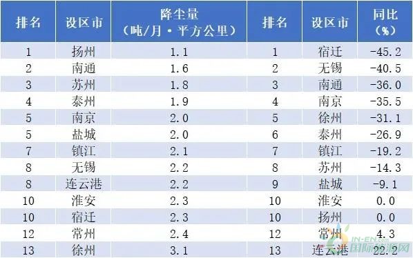 降塵量改善幅度由好到差依次排序為:宿遷、無錫、南通、南京、徐州、泰州、鎮(zhèn)江、蘇州、鹽城、淮安(揚州并列)、常州、連云港。
