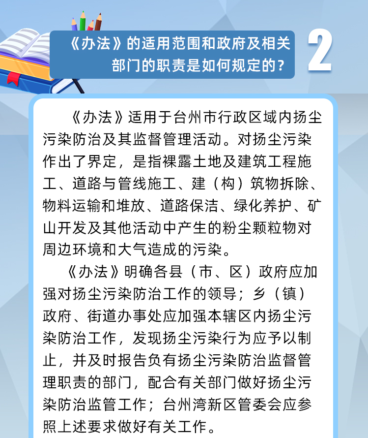 為有效遏制揚塵污染,改善環境空氣質量,保障群眾身體健康,近日,浙江省臺州市政府發布了《臺州市揚塵污染防治管理辦法》(以下簡稱《辦法》),《辦法》的發布實施,是我市加強大氣污染防治管理、持續打贏“藍天保衛戰”的一項重要舉措。現對《辦法》解讀如下: