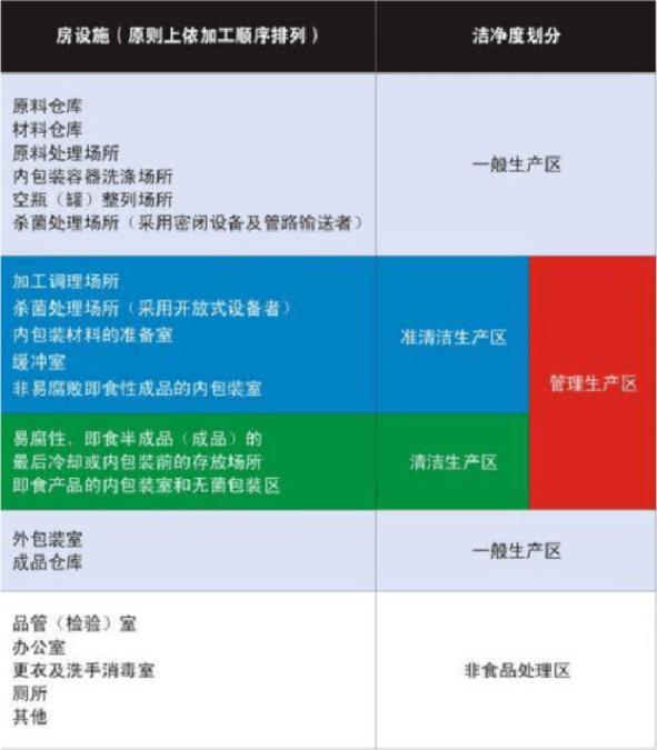 生產車間的安排及衛生等級的劃分為了便于對不同生產區域進行設計和衛生管理,通常將食品工廠車間按車間(區域〉的潔凈度不同劃分為非食品處理區、一般生產區、準潔凈生產區和潔凈生產區。準潔凈生產區和潔凈生產區屬于管制(監管)生產區,如表1-1所示: