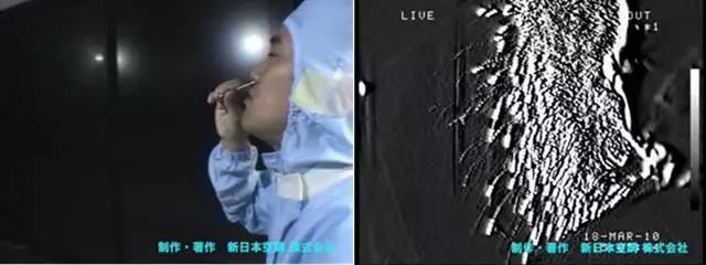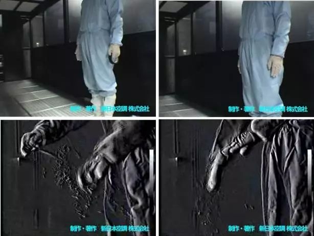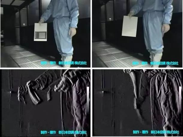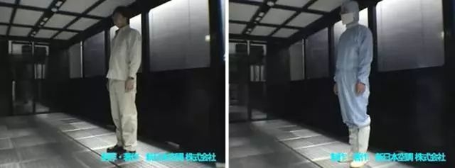 左邊是穿一般的工作服走路時(shí)候發(fā)塵的樣子。右邊是穿潔凈服走路時(shí)候發(fā)塵的樣子。