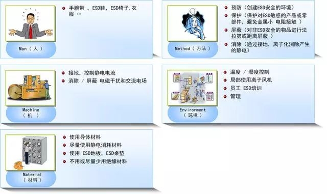 ESD控制= Man(人)+ Machine (機(jī)) + Material (料)+ Method(法)+ Environment(環(huán))。