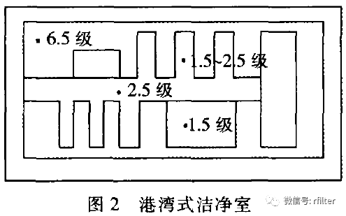 1.1 無塵車間從平面布置劃分一般有三種形式:即開放式( ballroom type)、港灣式(baycliasetype)、島形布置(island type),如圖1、2、3。