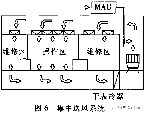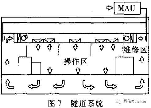 1.2無塵車間從送風系統方式劃分一般也有三種形式:即集中送風系統(central system)、隧道系統(tunnel systerm、FFU系統(fan filter unitsystem),如圖6、7、8。