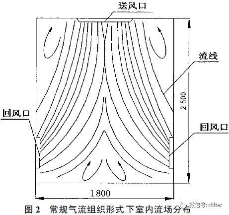 1000 級無塵車間常規送、回風方式下造成的室內氣流分布見圖2[2]。室內大部分區域, 尤其是工作區(距地面1 ~ 1 .5 m 左右的區域)處于主流區。因為通常