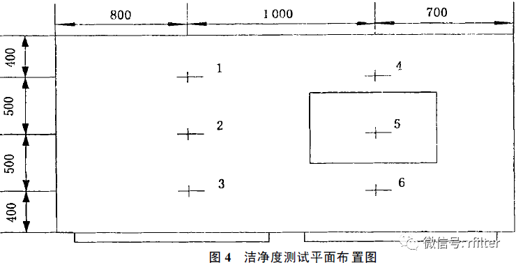 為了證明以上分析的正確性, 對圖1 所示的無塵車間潔凈度進行了實測。測試是在模擬動態工況下進行的。測試儀器采用Y09 9 型激光粒子計數器。在無塵車間地面以上1.2 m左右的高度布置6 個測點, 測點布置見圖4 , 每個測點測3 次, 取其平均值作為最終結果, 潔凈度測定結果見表1 , 測試時換氣次數n 2= 83 次/h 。按規范規定, 對于1000 級無塵車間來說, ≥0.5 μm的粒子濃度應≤35個/L[3]。由測定結果可知, 無塵車間潔凈度完全滿足1000 級的要求, 證明新型氣流組織形式是適用的。