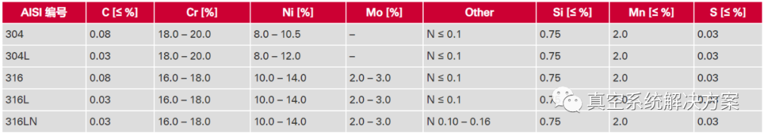 歐洲常用鋼號可與AISI(美國鋼鐵協會)類似材料名稱通用,如1.4301對應304、1.4307和1.4306對應304L、1.4404和1.4435對應316L以及1.4429對應316LN。不過,材料只是大約類似。真空應用的差異大多是非常微小的。然而,對于特殊要求,必須針對個別情況單獨評估通用性。示例:如果某個部件需要材料1.4301,一般必須有相關材料證書。如果證書只顯示材料304,則未滿足要求。此時,證書中的名稱很重要。如果滿足相應的材料規格,制造商也可證明半成品具有幾個名稱。例如,如果材料被證明為1.4301、1.4307、304和304L,用途則會更加多樣化。