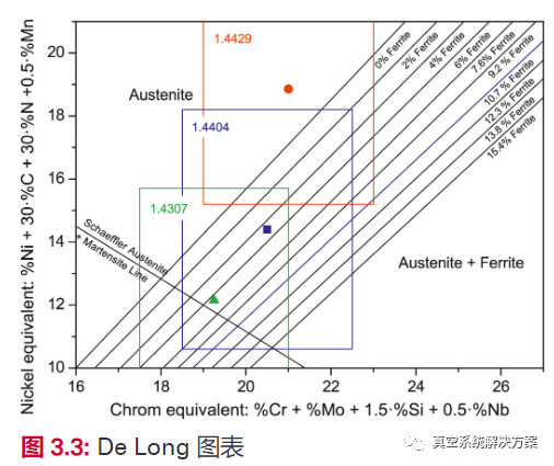 在圖3.3中,對于某些不銹鋼,顯示了鉻和鎳當量區域(彩色矩形),并以圖標給出其平均當量。