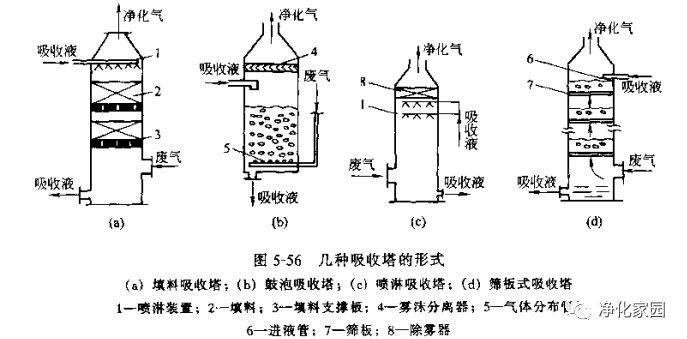 在產品生產中的濕法化學腐蝕、酸液清洗、實驗室內均有酸性氣體排出,在這類酸性氣體的排風系統通常設置溫式洗氣吸收塔,處理后排入大氣,圖5-56是幾種吸收式洗氣塔的形式。實際設計時應根據酸性氣體的類型、濃度選用合適的吸收液和吸收塔的形式[20]。