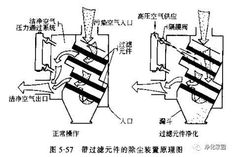 (6)含粉塵的排風系統,鑒于產品品種不同、生產工藝過程不同,排氣中的粉塵性質、濃度均各不同,應根據其排氣中的粉塵性質、濃度選用各類除塵裝置,一般采用布袋除塵器、帶過濾元件的過濾裝置[21],圖5-57是一種帶過濾元件的過濾除塵器,