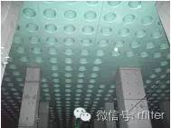為了滿足防微震、空氣循環(huán)的需要和防治塵埃粒子附著,有潔凈度要求的電子芯片廠房一般采用華夫樓板(Chess Slab),華夫樓板由華夫模板和鋼筋混凝土組成的鋼混結(jié)構(gòu)。華夫模板(FRP ,環(huán)氧玻璃鋼)是一種新型的復(fù)合材料,混凝土澆筑后與剛度大的密肋交叉梁系和鋼筋混凝土剪力墻一起組成樓層結(jié)構(gòu)防微震系統(tǒng),底模一般不拆除,做為永久性模板同時取代了潔凈要求的頂棚環(huán)氧涂料,如右圖。以滿足電子廠房的潔凈度要求。本文結(jié)合中芯國際FAB15芯片生產(chǎn)廠房工程華夫板施工的實(shí)例來介紹下華夫板施工工藝和注意事項。