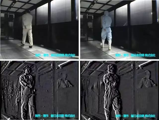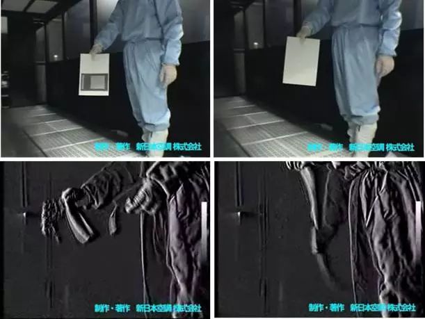 左邊是穿一般的工作服走路時候發塵的樣子。右邊是穿潔凈服走路時候發塵的樣子。