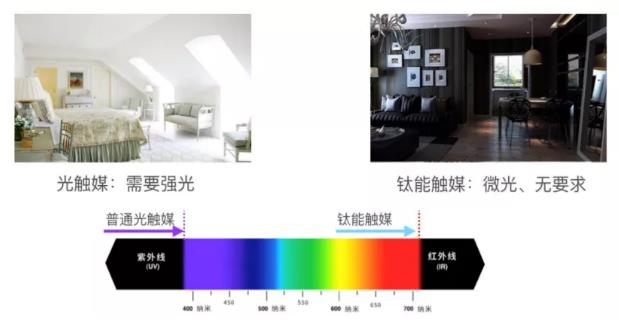普通光觸媒需要可見光甚至紫外光才能發生反應,而鈦能觸媒對光線要求低,只要有空氣就能分解有害氣體。