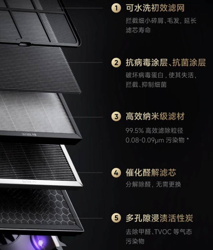米家全效空氣凈化器開啟后,空氣依次通過可水洗初效濾網,攔截細小碎屑、毛發、延長濾芯壽命;抗病毒涂層、抗菌涂層,破壞病毒蛋白,使其失活,攔截、抑制細菌;高效納米級濾材,99.5% 高效濾除 0.08-0.09μm 污染物;催化醛解濾芯,分解除醛,無需更換;多孔隙浸漬活性炭,去除甲醛、TVOC 等氣態污染物;全幅光幕紫外 UV 模組,消毒殺菌,維護濾芯潔凈。