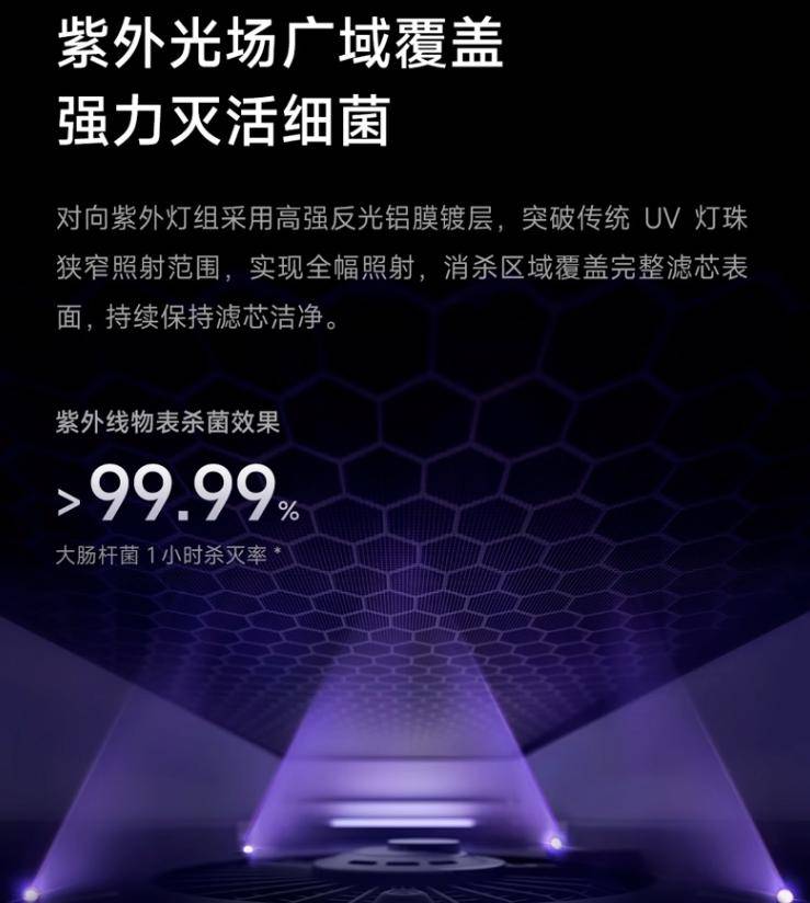 最后,為了更好地提升殺菌消毒的性能,米家全效空氣凈化器還搭載了自研的 Infinity-UV 全幅光幕技術。這項技術使用 4 盞 UV 大燈和高強反光鋁膜鍍層,突破了傳統 UV 燈珠的狹窄照射范圍,實現了全幅照射。這使得消殺區域可以覆蓋整個濾芯表面,保持濾芯的潔凈,多種病菌除菌率達到 99.99% 以上。這些先進的設計和技術都使得米家全效空氣凈化器成為了一款性能優秀、功能齊全的空氣凈化器。