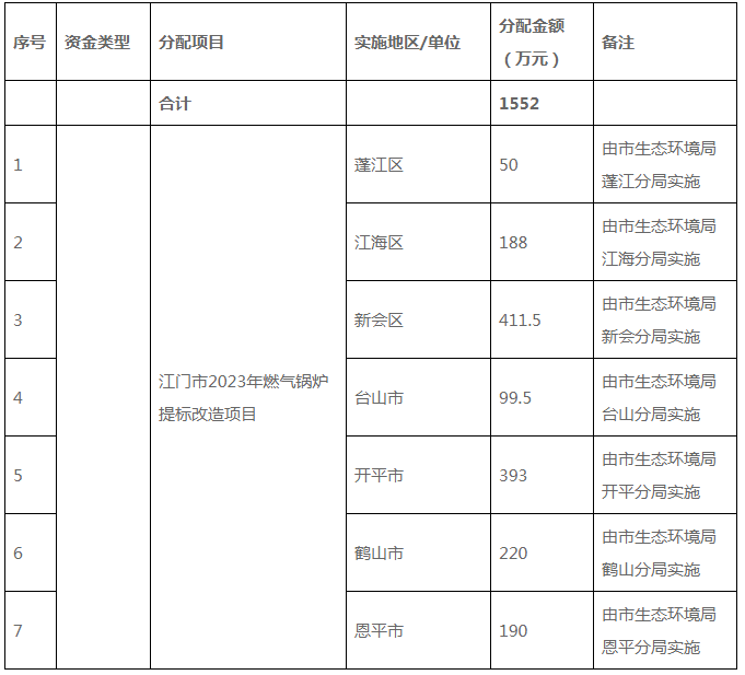 2023年中央財政污染防治資金燃氣鍋爐提標改造項目分配方案的公示