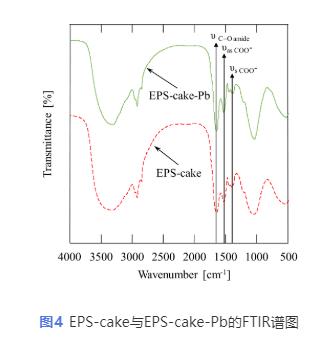 EPS-cake和EPS-cake-Pb的FTIR光譜圖(圖4)中均顯示了多糖、蛋白質、脂質和核酸中的典型官能團,表明Pb2+沒有改變EPS中的分子結構。對于EPS-cake-Pb,COO-的反對稱伸縮振動峰(vascoo-)與對稱拉伸振動峰(vscoo-)之間的距離變大,表明EPS中羧酸根以架橋形式與重金屬離子作用。