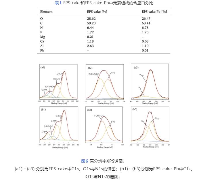 高分辨率XPS掃描圖(圖6)獲得的主要官能團含量(表2),表明羧酸鹽和糖醛酸中羧基或酯基通過離子交換或絡合作用與HMIs結合,以及EPS中蛋白質的酰胺和氨基基團通過絡合作用與Pb2+結合。