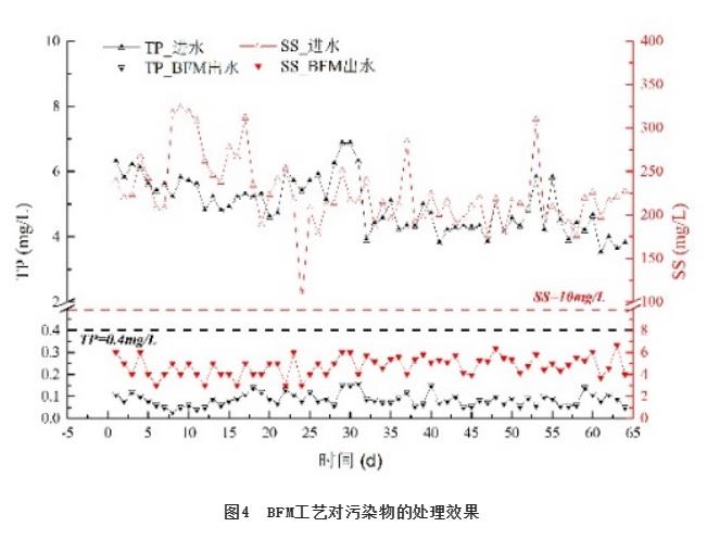 從圖4可以看出,實際進水水質波動較大,峰值基本能夠接近設計值。在系統進水COD、氨氮、TN、TP、SS分別為(336.17±44.90)、(43.95±5.97)、(49.77±6.70)、(4.97±0.82)、(225.15±40.00)mg/L的情況下,經過BFM工藝處理后,出水COD、氨氮、TN、TP、SS分別為(21.86±3.26)、(0.44±0.24)、(10.19±1.37)、(0.09±0.03)、(4.77±0.89)mg/L,出水水質穩定且優于準V類設計標準,BFM工藝系統具備良好的脫氮除磷性能以及抗沖擊性能。