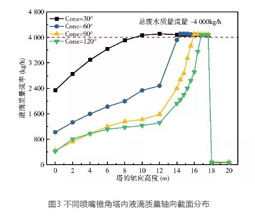 從煙氣逃逸量可以知道,在保證較佳的煙氣流速和液滴粒徑工況下,30°~120°錐角范圍內(nèi),脫硫廢水逃逸不到總廢水量的2.5%,可以認(rèn)為噴嘴錐角對于煙氣攜帶液滴的影響不大。但從廢水直接回落到蓄水池以及廢水蒸發(fā)的效果來看,其受噴淋的錐角的影響較大,其中30°錐角時(shí)廢水回落量達(dá)到了總廢水量的58.5%,而錐角為90°和120°時(shí)僅為11%左右。主要是因?yàn)檩^小的噴淋錐角使得液滴集中在噴嘴下方,氣流與液滴之間的相互作用減小,降低噴淋液滴的速度衰減,液滴的停留時(shí)間也相應(yīng)減少,此外氣液兩相的傳熱傳質(zhì)效率減低,進(jìn)而廢水蒸發(fā)效率低,更多的液滴回落到塔底。