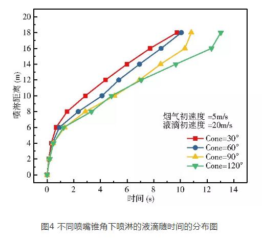 液滴在塔內(nèi)的停留時(shí)間直接影響了其蒸發(fā)效率的高低,利用塔內(nèi)不同高度截面對廢水液滴進(jìn)行采樣捕捉,統(tǒng)計(jì)液滴到達(dá)各個(gè)截面的所需的平均時(shí)間,圖4即為從噴嘴出口噴淋的液滴隨時(shí)間的分布情況。剛離開噴嘴1s左右的時(shí)間,不同噴嘴錐角下的液滴分布較為相近,這是因?yàn)槌跏茧A段液滴的速度衰減主要受液滴初始速度的影響,而液滴之間的分散情況影響較小,而大于2s后,從較小錐角噴淋的液滴分布較為集中,核心處的液滴受煙氣曳力作用降低,依舊能夠保持一定的流速通過蒸發(fā)空間,降低液滴在塔內(nèi)的停留時(shí)間。