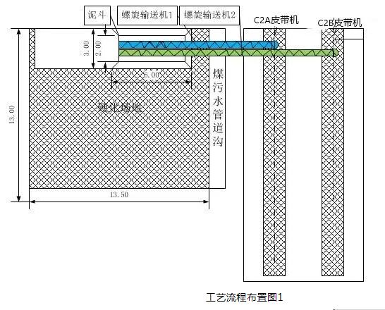 工藝流程為:車載污泥→C2堆放場地→無軸螺旋給料進料口→無軸螺旋給料機→無軸螺旋給料出料口→C2A帶式輸送機/C2B帶式輸送機→輸煤系統其它帶式輸送機→原煤倉→磨煤機→鍋爐(燃燒)