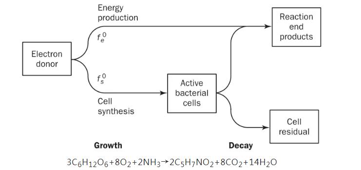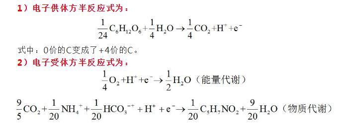 任何氧化還原反應,都是由兩方參與的,電子供體方(氧化反應)和電子受體方(還原反應),參與的兩方必須保證電荷守恒。好氧環境下,C6H12O6作為外碳源,是提供電子供體的一方,它提供的電子有兩個去處,去用于產能(能量代謝),去用于微生物的增殖(物質代謝),下式為C6H12O6同時參與能量代謝及物質代謝的綜合表達式。