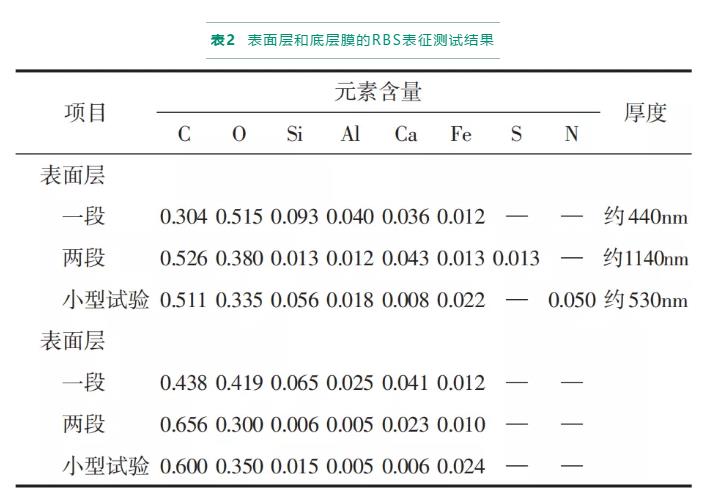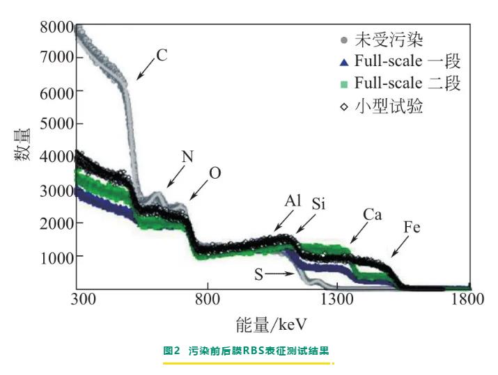 無機污染主要是由水中存在的無機鹽在膜表面逐漸累積,最終形成的無機垢所引起的。無機鹽結垢過程較復雜,常存在多種無機鹽的共沉淀和相互作用。SEM、EDS、XRD等結構表征和膜表面滴酸測試是常用的無機污染診斷手段。Ruiz-García等對用于苦咸水脫鹽運行11年的反滲透膜元件進行了剖檢分析,剖檢對象選擇的是四種不同位置的膜元件,分別包含一段和二段反滲透系統的首末支膜。其中一段的第一支膜可以直觀地看到有褐色沉積物,二段的最末支膜可以看到有粗糙的黃色垢,經SEM-EDS表征及膜表面滴酸分析,得出膜污染物主要是含有碳酸鈣和硅鋁酸鹽的無機污染。XPS是常用于表征膜表面元素組成和化學結構的分析手段,但XPS只能檢測膜皮層頂端,檢測深度一般只有7nm;RBS也可以用于分析膜表面元素組成和結構,且RBS檢測深度約2μm,比XPS能檢測的深度更深,因此RBS還能用于檢測污染層的厚度。Gorzalski等利用RBS研究膜表面污染物情況,對用于含硅地下水處理運行2.5年的納濾膜元件進行了剖檢分析,剖檢對象選擇的是一段和二段納濾系統的首末支膜元件。通過SEM、XPS、RBS等表征分析,得出膜污染物主要是含有Fe、Ca、Si、Al、S元素的無機污染,其中一段膜元件的Si和Al含量較高,二段膜元件的Ca污染較重。表2和圖2是RBS對污染前后膜的表征結果對比,由RBS結果可得到XPS無法獲得的信息,如不同工段的污染層厚度不同,并且RBS能探測整個污染層,與XPS只能探測皮層所得到的Si元素含量不同。