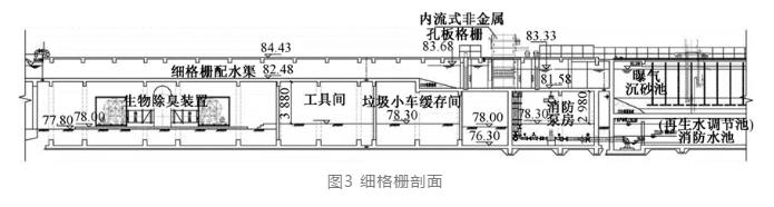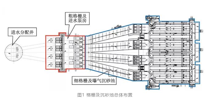 鄭州新區(qū)污水處理廠二期工程格柵和沉砂池土建規(guī)模按照遠期55萬m3/d一次建成,設(shè)備按照近期35萬m3/d進行安裝。本工程將格柵和沉砂池進行合建,同時集合了粗格柵及提升泵房、細格柵及曝氣沉砂池、消防泵房、消防水池、再生水泵房、再生水調(diào)節(jié)池、生物除臭裝置、工具間、垃圾小車緩存間,共9種功能單元。本項目在設(shè)計階段充分利用平面和豎向空間,集約化設(shè)計,達到了節(jié)省占地、降低工程費用的目的;并且對設(shè)備安裝、巡檢、物料運輸路由等影響因素進行重點規(guī)劃,實現(xiàn)了整體化、集約化、系統(tǒng)化和人性化的設(shè)計理念,可供同類工程參考。