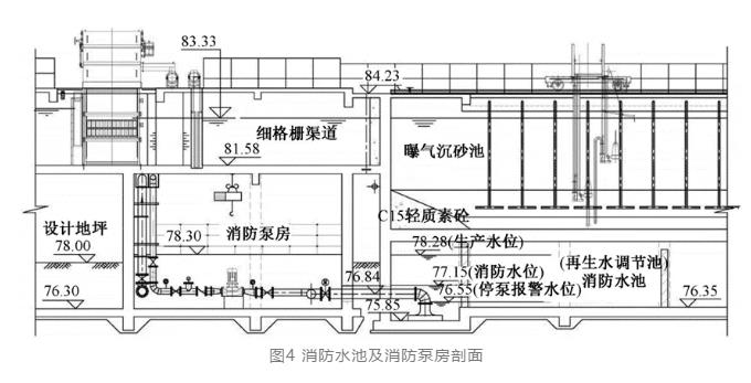 根據(jù)《消防給水及消火栓系統(tǒng)技術(shù)規(guī)范》,本項目同一時間內(nèi)的火災(zāi)起數(shù)按1起考慮。消防給水1起火災(zāi)滅火用水量應(yīng)按需要同時作用的室內(nèi)外消防給水用水量之和計算,兩座及以上建筑合用時,應(yīng)取最大者。鄭州新區(qū)污水廠二期工程消防用水量最大的建筑為干化車間,經(jīng)計算消防總水量為1 026 m3。消防水源采用污水廠處理后的再生水。本項目消防水池有效容積為1 050 m3,根據(jù)《消防給水及消火栓系統(tǒng)技術(shù)規(guī)范》要求,應(yīng)設(shè)置能獨立使用的兩座消防水池,見圖2。因工藝水力高程需要,細格柵及曝氣沉砂池豎向標高位于設(shè)計地坪以上,可利用細格柵及曝氣沉砂池下部空間設(shè)置消防泵房、再生水泵房、再生水調(diào)節(jié)池和消防水池,見圖3~圖5。