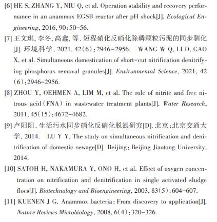 缺氧好氧工藝(Anoxi/oxic,A/O)主要通過設置缺氧池和好氧池分別實現反硝化(NH+4→NO2→NO3)和硝化反應(NO3→NO2→N2),實現對廢水氨氮的去除。但研究表明傳統硝化反硝化過程中會產生亞硝態氮的累積現象[3]。為此,提出了短程硝化反硝化的理論,通過促進氨氧化菌(亞硝酸菌)生長,抑制亞硝酸氧化菌(硝酸菌)的生長,從而實現短程硝化反硝化的進程(NH+4→NO2→N2)。氨氧化菌的生長周期短于亞硝酸氧化菌,其中泥齡、溫度、pH 和溶解氧等是影響氨氧化菌和亞硝酸氧化菌的主要因素。溫度大于28 ℃時利于氨氧化細菌生長,抑制亞硝酸氧化菌的生長;pH 在 8.0 附近也利于氨氧化菌積累;氨氧化細菌對低濃度溶解氧的親和力大于亞硝酸氧化菌[4-6]。理論上短程硝化反硝化縮短了反應時間,節約了氧氣和碳源供應量,同時降低了污泥產量[7]。但在水處理設施運行過程中由于需要增加污泥排出,以降低泥齡,因而每日會產生大量的污泥。此外,由于影響因素較多,其穩定性也需要進一步的改進。