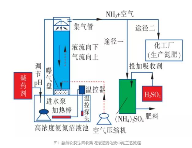 由于液態回收氮存在上述問題,因此,研究人員將污水氮回收轉向氣態回收,即通過升高液體溫度或pH值的方式提高氨離解率,再通過曝空氣或水蒸氣等載氣方式將NH3與液體分離后用于氮肥生產,以減少工業合成氨的成本。其中,最具代表性的技術就是氨氮吹脫法,圖1為某養豬場污泥消化液利用氨氮吹脫法回收氨氮裝置。