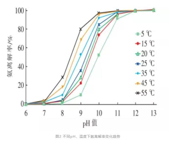 氨氮吹脫效率與液體中游離NH3比例(氨離解率)存在重要關系,而氨離解率又受pH、溫度、氣水比、氨氮濃度等條件影響。不同pH、溫度下氨離解率變化如圖2所示。
