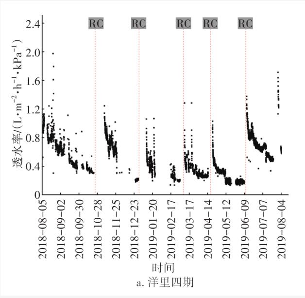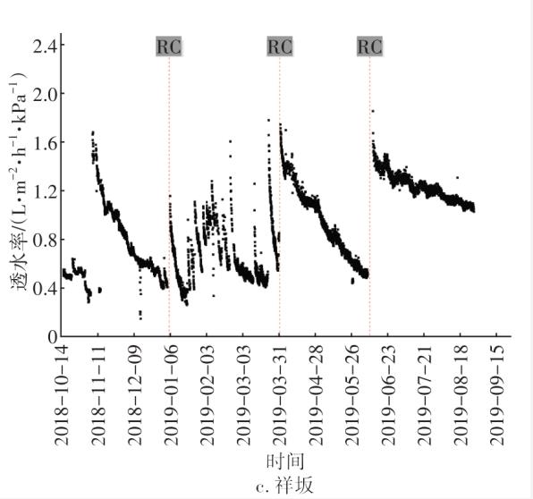 分別選取洋里四期、洋里二期和祥坂的1個膜池,2018年8月—2019年8月期間其透水率隨時間的變化情況如圖1所示。3個MBR工程的運行條件類似,其中,洋里四期的膜運行年限最長,整體透水率較低。