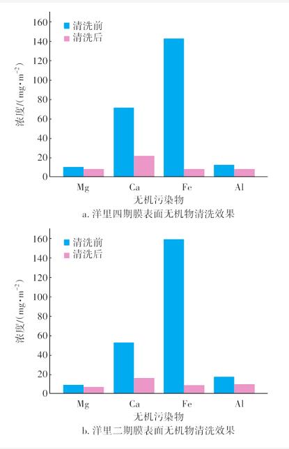 ① 所調(diào)研的3個MBR工程現(xiàn)有的膜清洗方案能夠去除部分污染物,使膜通量在一定程度上恢復(fù);恢復(fù)性清洗后,膜表面的有機污染物和無機污染物均仍有部分殘留;洋里四期的膜清洗效果較差,表面絮體纖維殘留較多;無機污染元素主要是Ca、Fe,檸檬酸對含F(xiàn)e元素的無機污染物具有較好的去除效果,祥坂的膜總體酸洗效果較差。