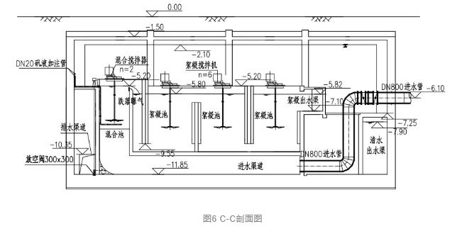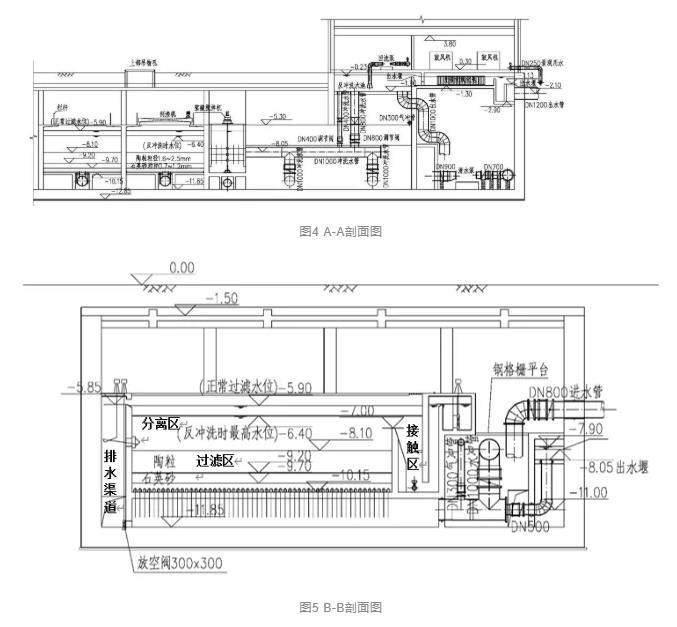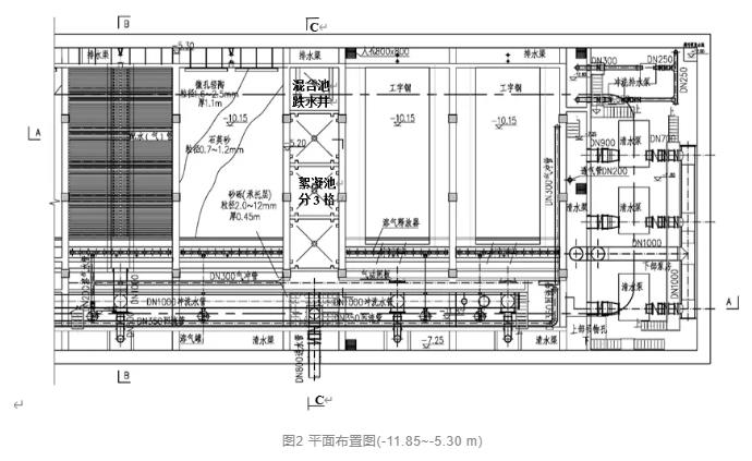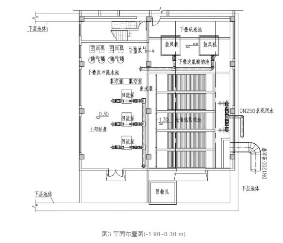 工程地下部分場地面積僅相當于普通濾池,需要布置主體處理構筑物和地下提升泵房,還需安排上下人流、物流通道。