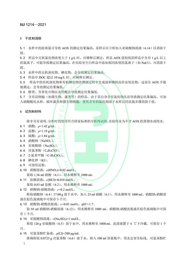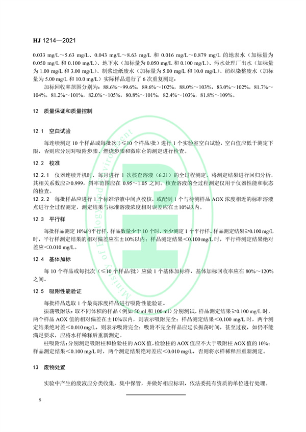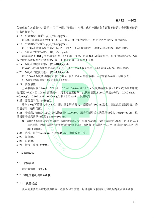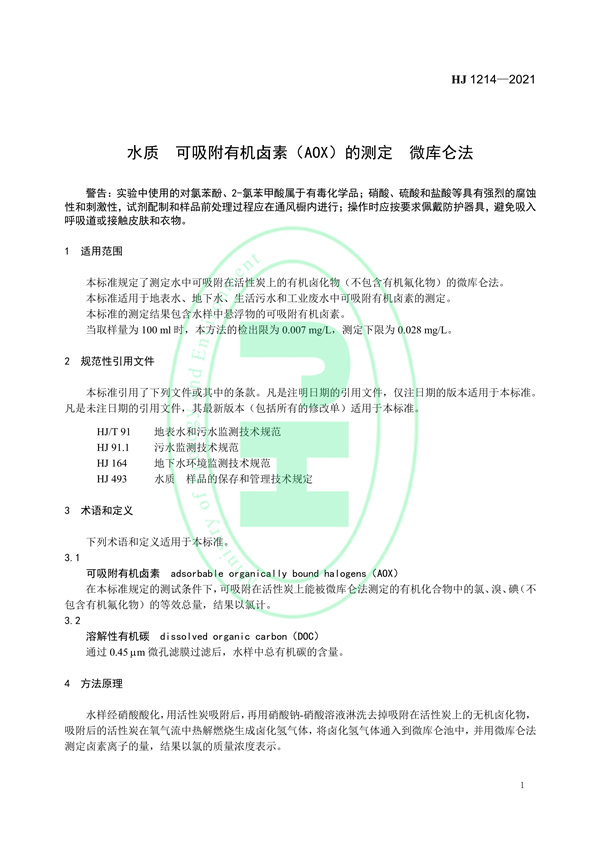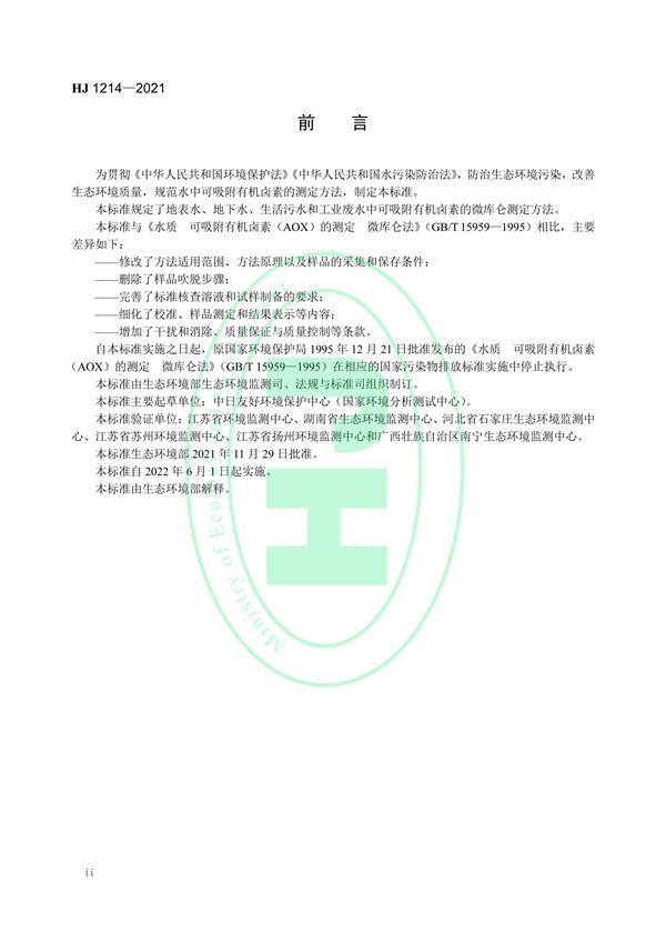為貫徹《中華人民共和國環境保護法》《中華人民共和國水污染防治法》,防治生態環境污染,改善生態環境質量,規范水中可吸附有機鹵素的測定方法,生態環境部制定了《水質可吸附有機鹵素(AOX)的測定微庫侖法》(HJ 1214-2021)。本標準適用于地表水、地下水、生活污水和工業廢水中可吸附有機鹵素(AOX)的測定,支撐《污水綜合排放標準》(GB 8978-1996)等實施。與《水質可吸附有機鹵素(AOX)的測定微庫侖法》(GB/T 15959—1995)相比,主要差異如下:——修改了方法適用范圍、方法原理以及樣品的采集和保存條件;——刪除了樣品吹脫步驟;——完善了標準核查溶液和試樣制備的要求;——細化了校準、樣品測定和結果表示等內容;——增加了干擾和消除、質量保證與質量控制等條款。標準詳情如下: