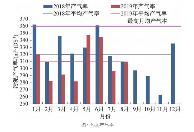 A廠升級改造后的污泥處理工藝流程見圖1,設計污泥處理能力為180 t DS/d,900t/d(含水率80%)。通過對A廠運行數據進行分析可知,污泥處理量(見圖2)接近設計值,且有逐年升高的趨勢;對應的產氣率分析見圖3,通過污泥熱水解,污泥產氣率有大幅提升。根據污泥有機物含量的檢測情況看,冬季污泥有機份含量較高,最高可達70%以上,夏季為50%上下,且夏季5月、6月雨水較少,運行溫度平穩,利于產氣,所以冬季1月份和夏季5月份、6月份產氣率較高,最高可達360m3/t DS,全年平均產氣率約為310m3/t DS。