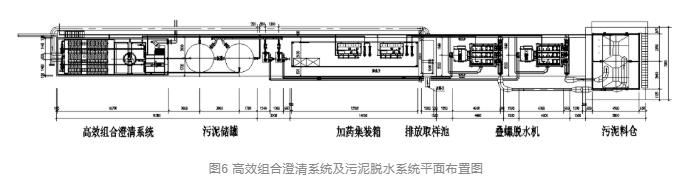 間歇性排放的沉淀池排泥水匯集于收集池內,通過泵提升后進入調節池中,對水量和水質做適當調整均化后,進入高效組合澄清系統進行進一步處理。處理后的水經過取樣排放池進行連續監測后,利用廠區原有排放口排放進入青龍港河道內。處理后的污泥進入污泥儲罐后由污泥泵打入疊螺脫水機進行機械脫水處理,最后對脫水污泥進行外運處置。排泥水處理流程如圖5所示,高效組合澄清系統及污泥脫水系統平面布置圖分別如圖6所示。