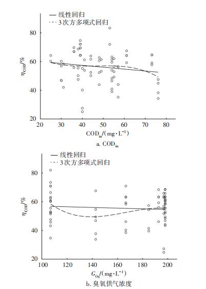 首先把35次試驗中每次試驗的二次取樣測定結果作為70例“個案”,變量包括CODin、HRT、GO3、LO3、O/C;因變量包括去除率ηCOD和出水濃度CODout。當然,這些變量中有的不是獨立變量,有的對試驗結果影響不大。首先,以ηCOD為因變量,對上述6個因素進行回歸分析,結果如圖2所示。