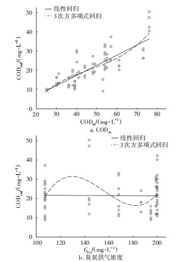 CODin:試驗點非常分散;不僅如此,線性回歸和3次方多項式回歸基本水平(略向下),由此可見進水CODin對處理效果影響的規律性不強。