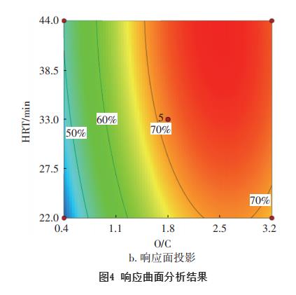 人們往往對“響應面分析”感興趣,因為其能全面地反映自變量與因變量的關系。本研究嘗試運用設計軟件進行擬合,采用水力停留時間HRT、臭氧相對投加量O/C兩個主要獨立自變量,考察ηCOD的響應。根據試驗范圍確定方案,每次的運行結果采用內插法分析數據,個別不在中試范圍的“運行”,其數據結果可采用外延法得到,由此得出試驗設計方案及結果,見表3。響應面分析結果見圖4。