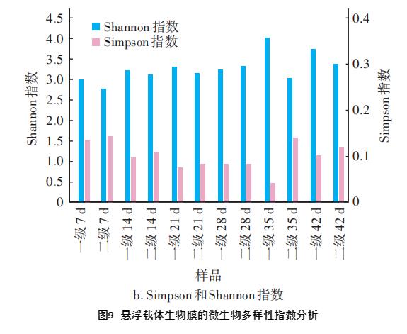 以Chao和Ace指數(shù)表征樣品物種的豐富度,指數(shù)值越大,說(shuō)明該樣本物種數(shù)越多。如圖9(a)所示,整個(gè)研究階段,生物膜的Chao和Ace指數(shù)均無(wú)明顯變化趨勢(shì),但除第21天外,其他時(shí)間一級(jí)生物膜的Chao和Ace指數(shù)均高于同期二級(jí)生物膜。可見(jiàn),系統(tǒng)在啟動(dòng)初期生物膜的物種豐富度就達(dá)到了較高水平,但受進(jìn)水負(fù)荷的影響,一級(jí)生物膜優(yōu)先發(fā)揮污染物去除作用,致使其物種豐富度高于二級(jí)生物膜。