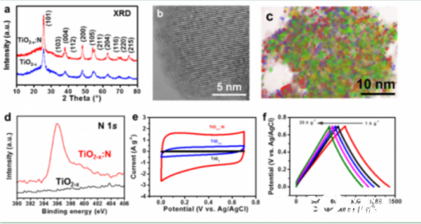基于前期發明的“低溫還原+元素摻雜”制備高導電黑色氧化鈦的制備方法,發現9.29 at%高濃度摻雜黑色TiO2-x :N 比電容高達750 F/g,改變了寬禁帶半導體二氧化鈦無法應用于超級電容器電極的傳統認識。