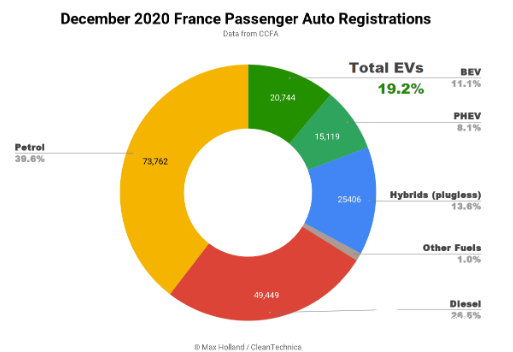 法國的插電式電動汽車市場份額在2020年12月創下19.2%的新紀錄,比2019年12月增長5.6倍,拉動全年市場份額達到11.2%。其中,雷諾ZOE再次成為本年度最暢銷的插電汽車。