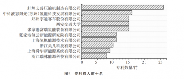 有數(shù)據(jù)統(tǒng)計(jì)顯示,高校和科研機(jī)構(gòu)是專利協(xié)同創(chuàng)新體系中的重要支撐,具有代表性和一定實(shí)力的企業(yè)可通過(guò)技術(shù)協(xié)作、合作開(kāi)發(fā)、共建研發(fā)實(shí)體、共建聯(lián)合實(shí)驗(yàn)室、研究基金合作等形式,借助國(guó)內(nèi)高校、科研院所的力量推動(dòng)氫能產(chǎn)業(yè)的合作研發(fā)。加強(qiáng)企業(yè)與高校、研究院所的合作,實(shí)現(xiàn)互相支持、互相滲透、互相介入、優(yōu)勢(shì)互補(bǔ)、資源互用、利益共享是促進(jìn)技術(shù)管理現(xiàn)代化的重要途徑。在加氫站技術(shù)中,企業(yè)發(fā)揮了創(chuàng)新主體的作用,但是在中國(guó)當(dāng)前大背景下,高校、研究院所的科技人力資源還應(yīng)發(fā)揮其創(chuàng)新主力的作用,使企業(yè)的主體地位與高校、研究院所的主力作用有機(jī)統(tǒng)一起來(lái)。專利權(quán)人前十名情況見(jiàn)圖2。