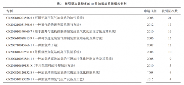 專利對(duì)其他專利文獻(xiàn)的引用體現(xiàn)了技術(shù)發(fā)展的規(guī)律、技術(shù)之間的繼承和積累,以及不同技術(shù)的交叉和滲透,同時(shí)也是專利價(jià)值的體現(xiàn)。被引證次數(shù)較多的10件加氫站系統(tǒng)相關(guān)專利見(jiàn)表2,主要涉及加氫站的氫氣生產(chǎn)設(shè)備、高壓供氫系統(tǒng)、加氫站的加氣系統(tǒng)、加氫控制系統(tǒng)、快速充裝氫氣的系統(tǒng)與方法、溫升與能耗控制方法、冷卻加注方法、氫燃料加注和卸載系統(tǒng)等多個(gè)技術(shù)領(lǐng)域。