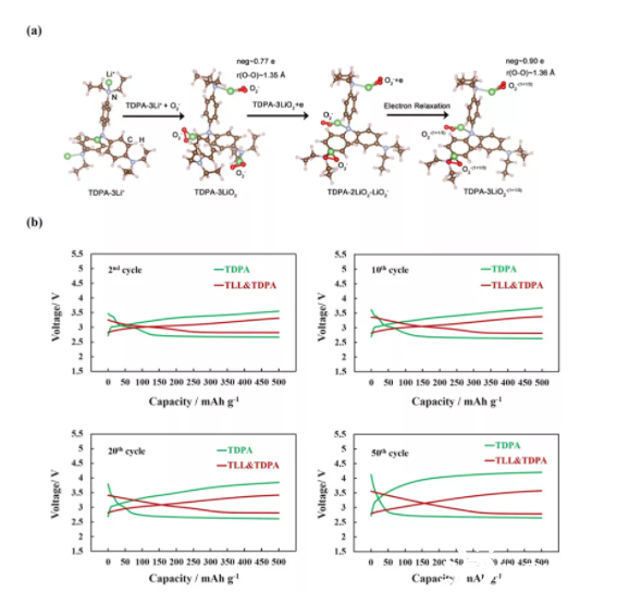 (a) Li+,O2-,LiO2和電子離域,neg為通過(guò)自然布居分析獲得的得電子數(shù);(b)TLL+TDPA電池和TDPA電池在第2,10,20和50周的充放電曲線(xiàn)。
