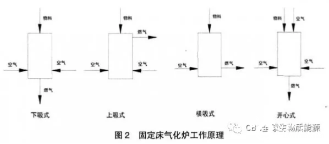 根據固定床爐內氣體流動方向的不同,將固定床分為四種爐型:下吸式、上吸式、橫吸式和開心式氣化爐[4],固定床氣化爐工作原理如圖2所示。下吸式氣化爐結構較簡單、工作穩定,可隨時開蓋添料,出爐可燃氣焦油雜質含量較少,該氣化爐主要應用在發電方面,目前中國和印度使用較多。燃氣在上吸式氣化爐內經過熱解層和干燥層時進行熱量的多向傳遞,并進行物料的熱分解和干燥,降低了燃氣自身的溫度,此種氣化爐結構簡單、運行方便、氣化效率高、氣體熱值高、含塵量低。橫吸式氣化爐內,通過單管進風噴嘴高速吹入空氣,形成一個高溫燃燒區(達2000t),此類型的氣化爐生產強度高,適合氣化較難燃燒的生物質物料。生物質物料和空氣自開心式氣化爐爐頂進入,反應溫度沿反應截面分布均勻,由于氣、固兩相同向流動,有利于焦油的裂解,生物質燃氣中焦油含量較低,該爐型生產強度在幾種固定床中居首位。