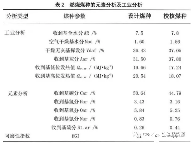 耦合燃煤發電鍋爐為東方鍋爐廠DG3000/26.15-II1型超超臨界本生直流鍋爐,該鍋爐為超超臨界參數、固態排渣、單爐膛、一次再熱、平衡通風、露天布置、全鋼構架、全懸吊結構、前后墻對沖燃燒方式的II型鍋爐。實際燃燒煤種的元素分析和工業分析如下見表2。